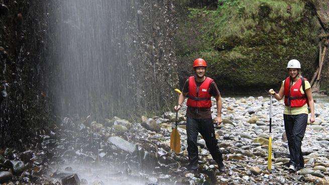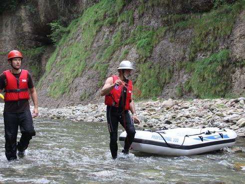 - Velo-Helm oder Kletterhelm, Badekleider, darüber eine Regenhose als Beinschutz, T-Shirt, evtl. leichte Regenjacke, Wasserschuhe zum binden (oder alte Turnschuhe), trockene Kleidung.