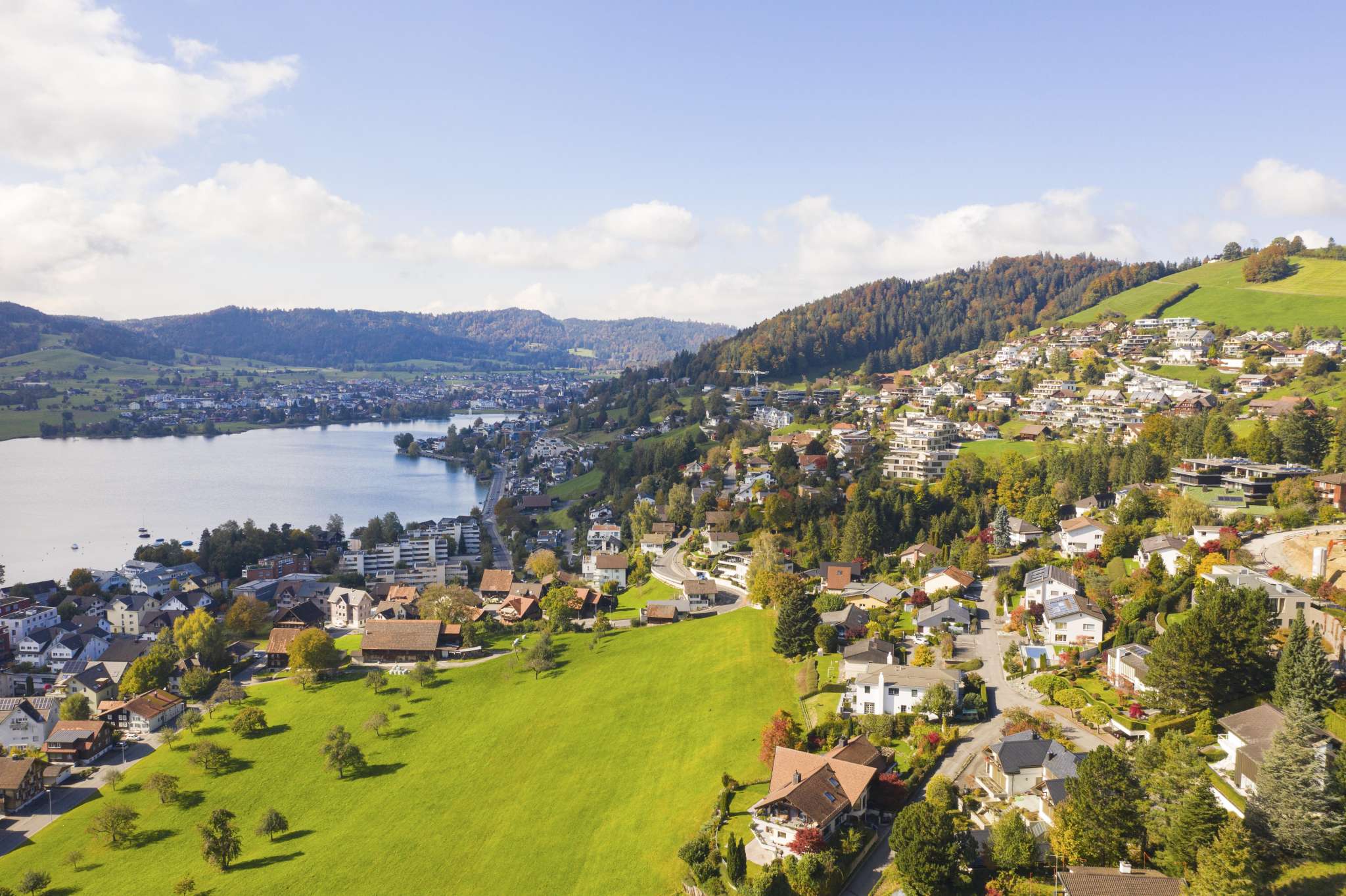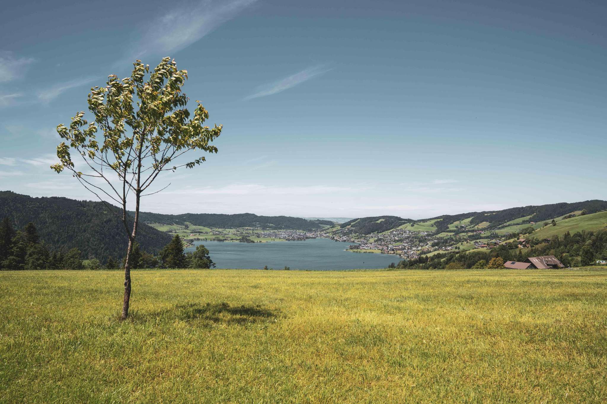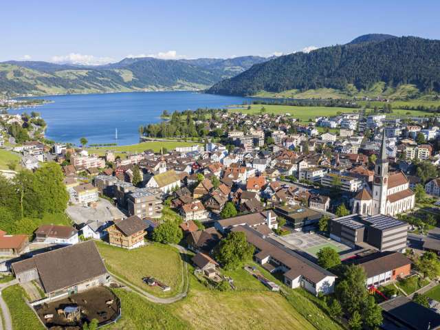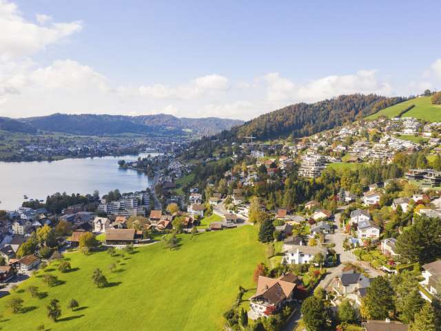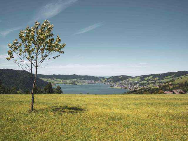 Sanfte, grüne Hügelketten, darin eingebettet der tiefblaue See. Die Region Ägerital-Sattel liegt im Herzen der Zentralschweiz und ist bekannt für ihre nebelfreie Lage.