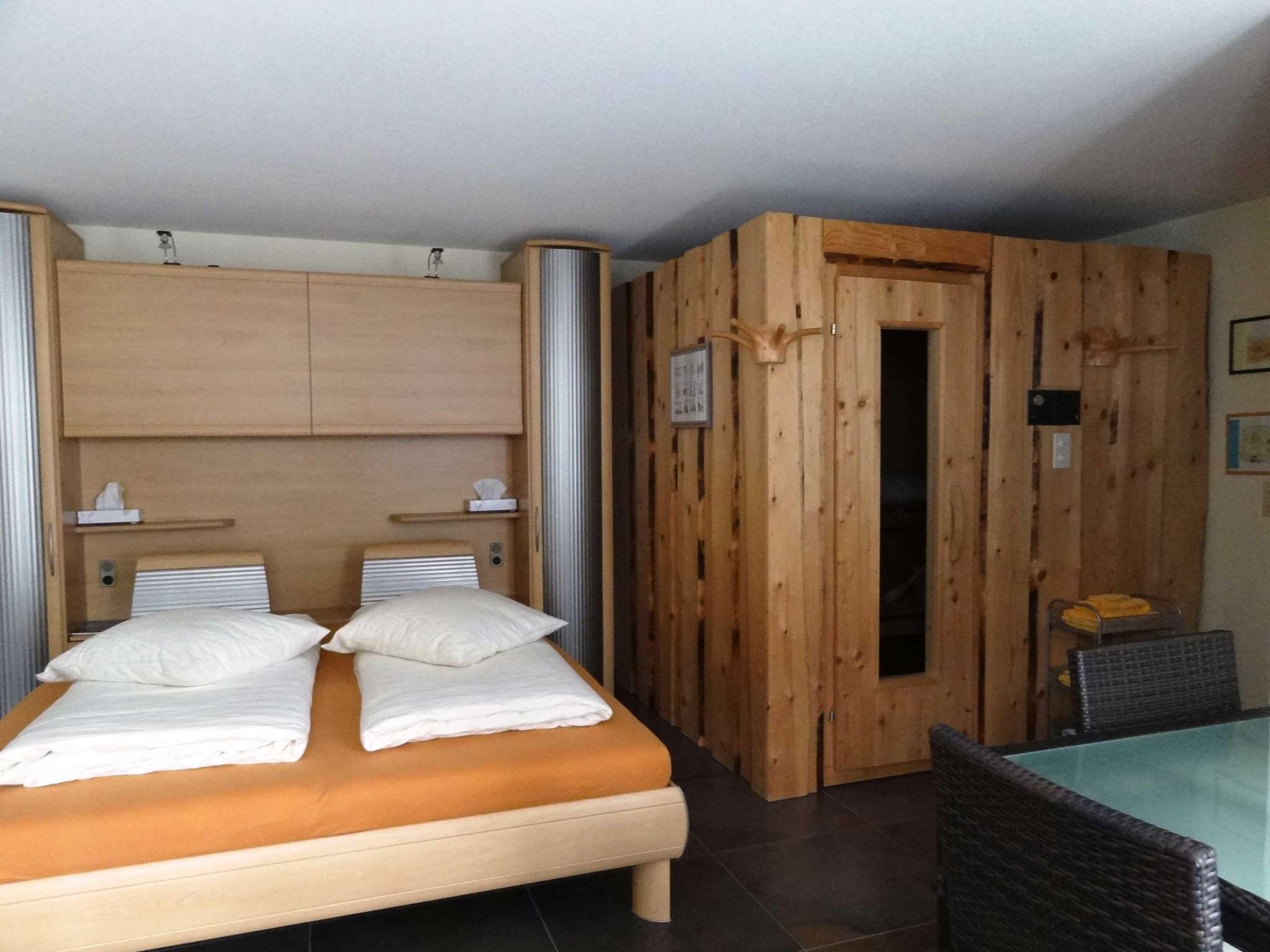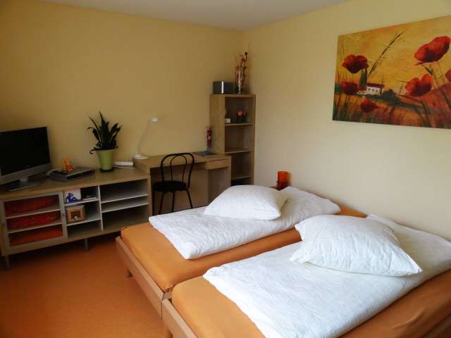 Wir bieten Ihnen Platz in zwei Zimmern zu max. 6 Schlafplätzen (2 und 4) mit Etagendusche/WC. Einen separaten Zugang im UG mit gemütlicher Sitzgelegenheit mit Teebar, Wasserkocher, Kaffeemaschine, Kühlschrank und Essgeschirr. Alle Räume sind rauchfrei und rollstuhlgängig. Kinderspielplatz und Rasen zur Mitbenutzung. Med. Massagen oder Sauna auf Anfrage im Haus möglich.
