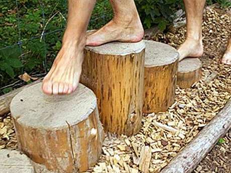Der Barfussweg befindet sich im Wald oberhalb von Wiedlisbach und beginnt gleich anspruchsvoll mit Kies, der frischgebackene Barfussgänger wohl spitzer vorkommen, als er das in Wirklichkeit ist. Als Nächstes kommt eine sehr angenehme Kassette mit quer gelegten Baumstämmen. Die Füsse atmen auf. Dann Holzschnitzel, runde Steine, Lehm, Tannzapfen und vieles mehr.