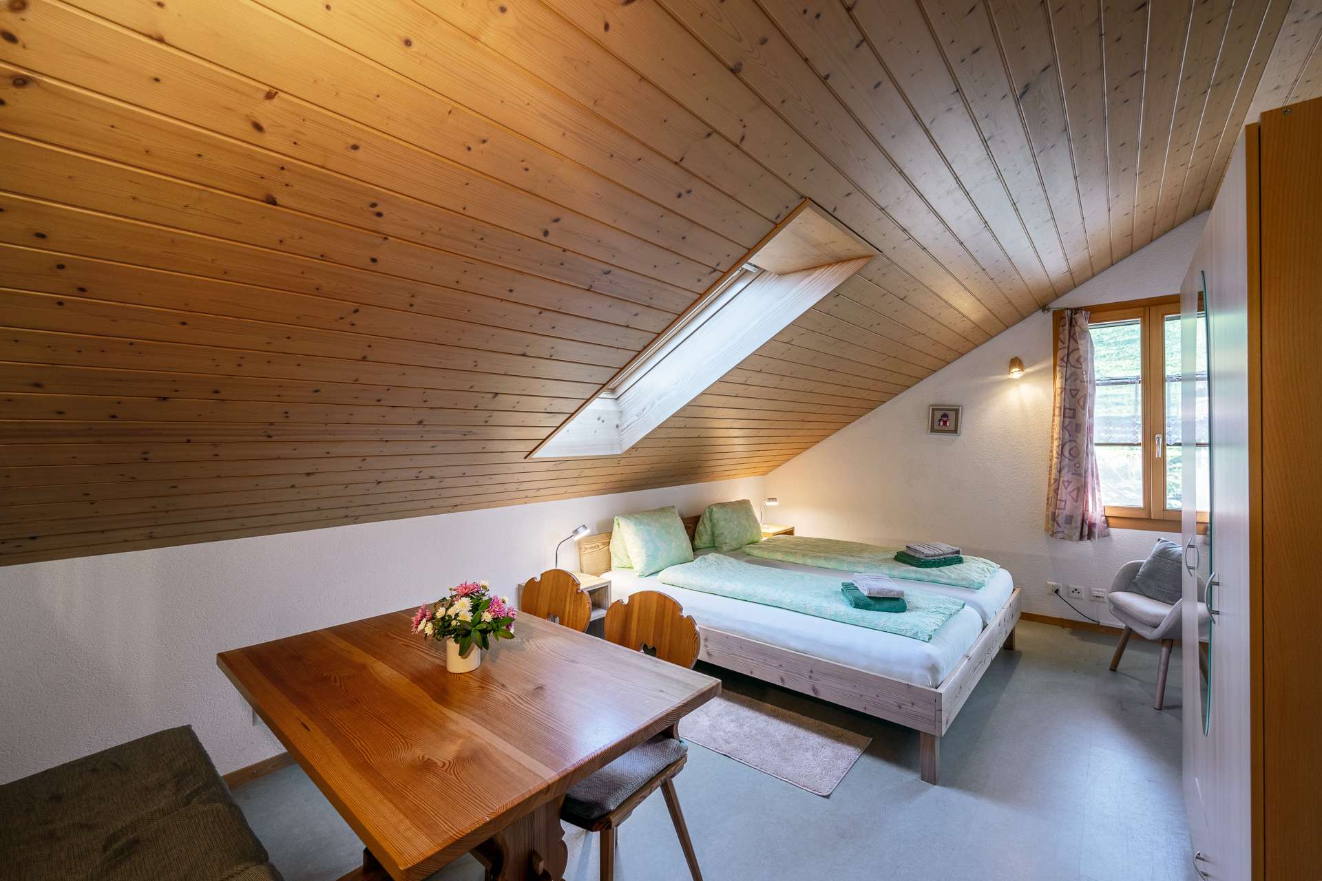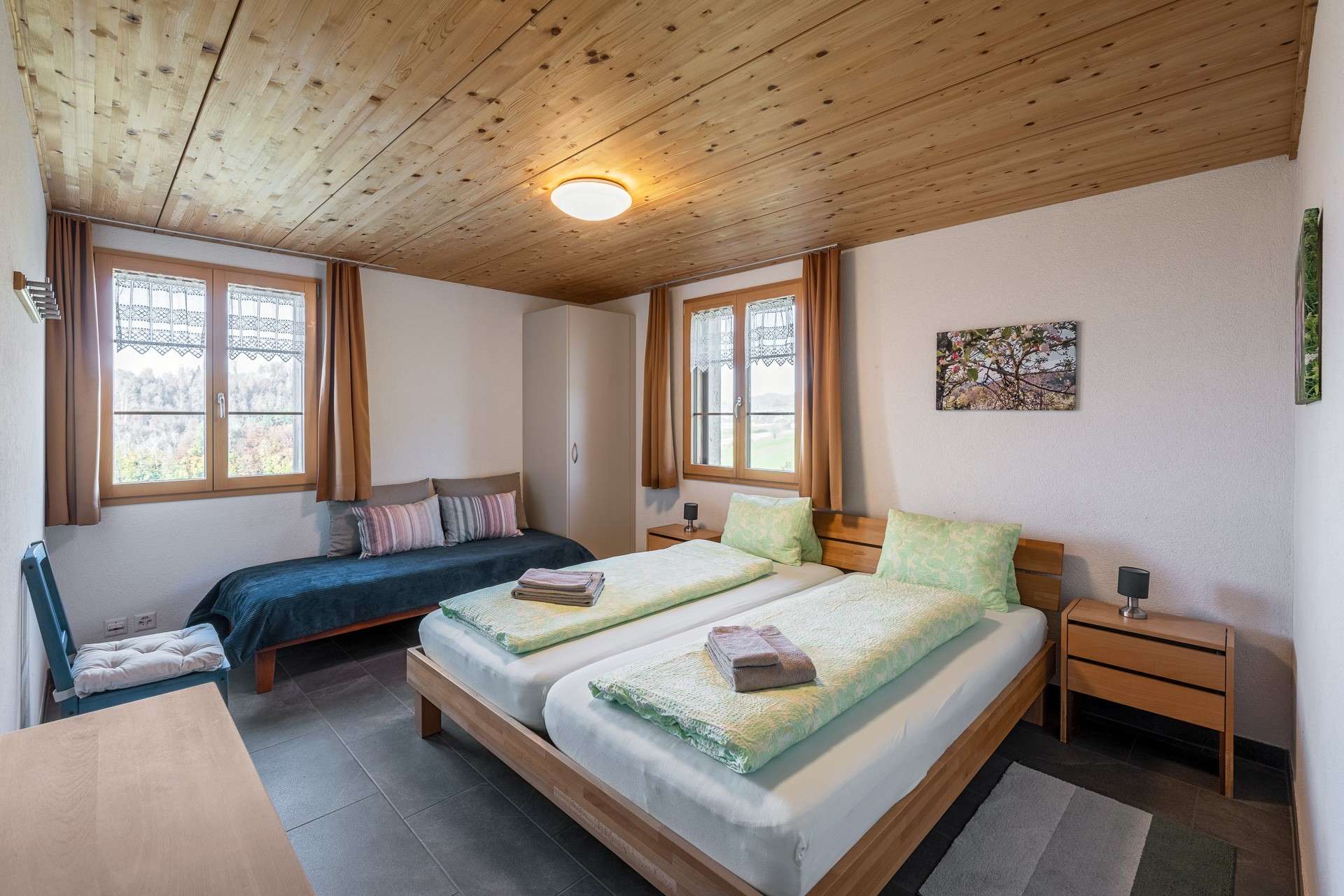 Hier finden Sie verschiedene gemütliche Übernachtungsmöglichkeiten: zwei Doppelzimmer und ein Mehrbettzimmer für 8 Personen im Gästehaus, zwei Doppelzimmer im Stöckli, eine Ferienwohnung mit 6 Betten im Bauernhaus und Schlafen im Stroh für 24 Personen. Im Aufenthaltsraum mit Selbstversorgerküche bieten wir allen Gästen ein reichhaltiges Frühstück an.