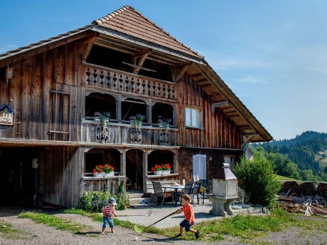 915 m.ü.M. Sonnige und ruhige Lage im Grünen mit Sicht auf die umliegenden Emmentaler Hügel und Berner Alpen. Ideal für Wanderfreudige, Familien, für alle, welche fernab vom Alltag Erholung suchen. Hunde sind herzlich willkommen! Auf unserem Landwirtschaftsbetrieb sind im Winterhalbjahr eine Mutterkuhherde und im Sommerhalbjahr Ziegen, welche morgens und abends draussen im Melkstand gemolken werden, zu Hause. Das Bimmeln der Kuh- oder Ziegenglocken verleiht Ihrem Aufenthalt ein uriges Alpenfeeling.... fast wie beim Heidi und Alpöhi.