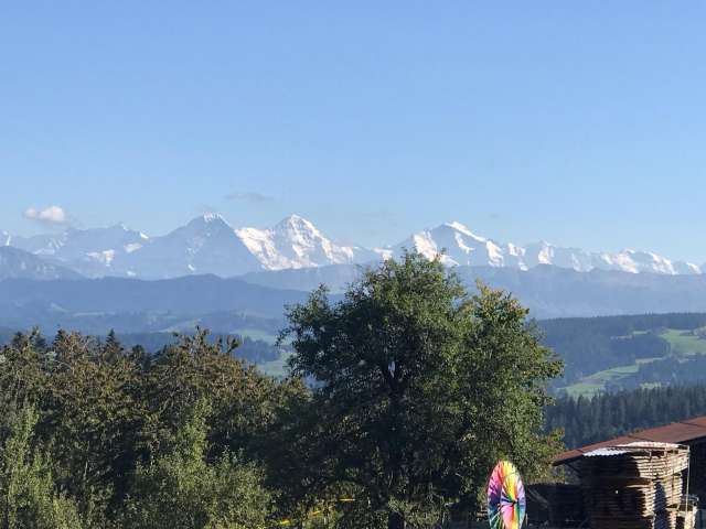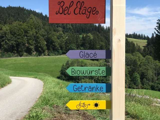 Während Du bei einem Bauernhof-Glacé, einem Getränk oder einer Bio Wurst den einzigartigen Ausblick auf die Berner Alpen wie zB. Eiger, Mönch und Jungfrau geniesst, lässt du bequem dein E-Bike an der hauseigenen Solarstrom-Station aufladen. Du bedienst dich selbst aus dem Kühlschrank und bezahlst bar oder per TWINT.