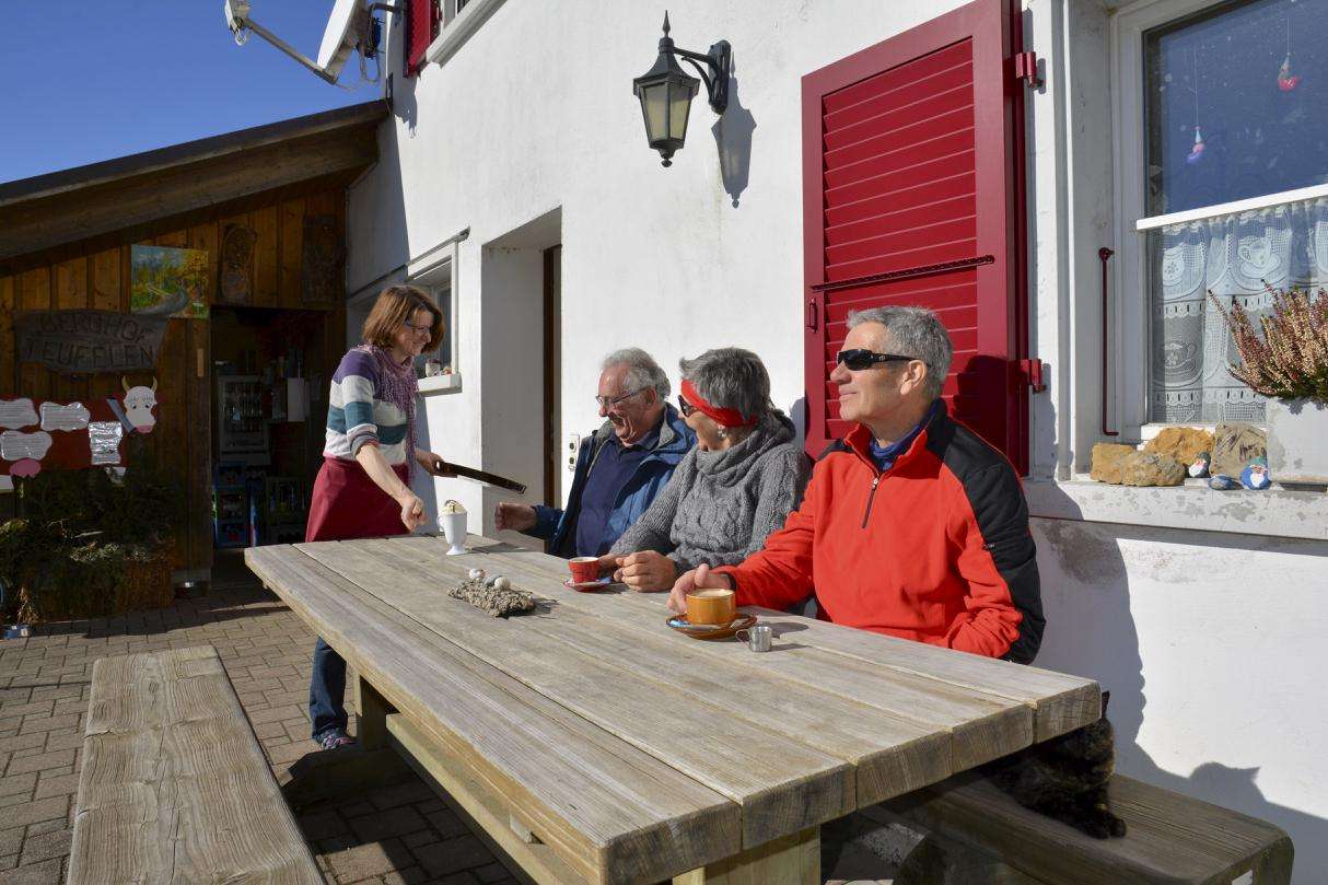 Die Gaststube mit heimeliger Atmosphäre und die Terrasse mit wunderschöner Aussicht. Die Spezialität des Restaurant ist das Zvieriplättli und der hausgemachte Hinterwälder-Käse.