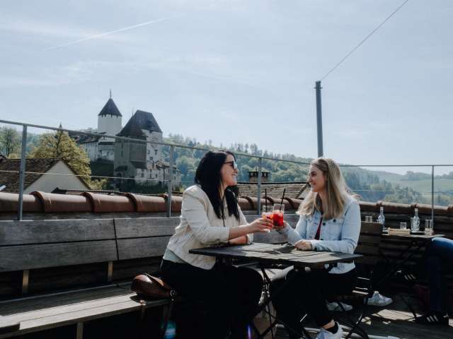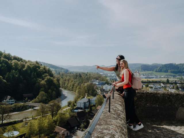 Weiter den Hügel hinauf. Auf der Burg angekommen gibt es verschiedene Dinge zu erkunden. Die alten Burgmauern, das Museum, das die Geschichte des Schlosses erzählt, das charmante moderne Restaurant und die unglaubliche Aussicht auf die Emme.