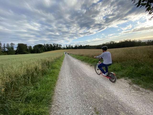 Für Ihre Entdeckungstour durchs Emmental stehen bis zu 20 E-Scooter bereit. Die «Hugo Bikes» sind eine Mischung aus Elektrofahrrad und Trottinett. Es reicht, am Startschlüssel zu drehen, und schon geht der Spass los. Das Elektrotrotti beschleunigt auch bergauf recht flott, und das grosse Vorderrad bietet eine Laufruhe, die sich gerade bei nassen Strassen als vorteilhaft erweist.
