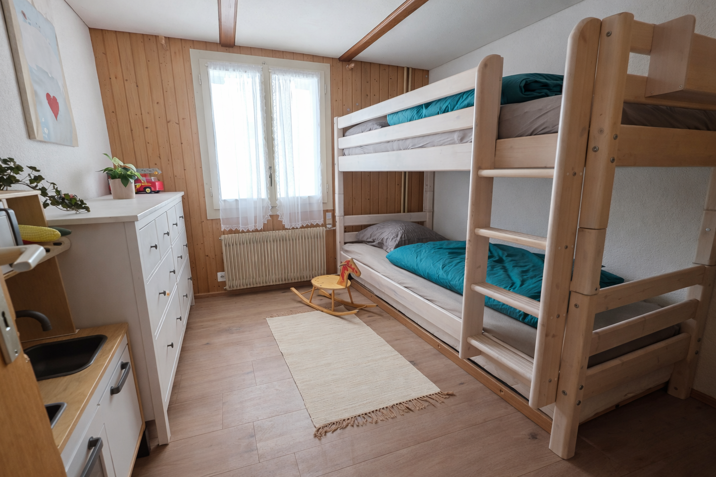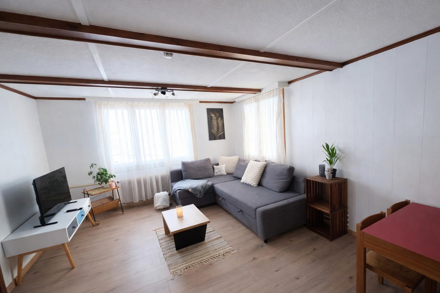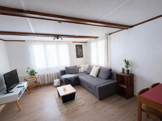 Die Wohnung ist gemütlich eingerichtet und ideal für Familien. Sie verfügt über eine Terrasse mit Gartenblick, zwei Schlafzimmer, ein Wohnzimmer, einen TV sowie eine gut ausgestattete Küche mit Kühlschrank und Geschirrspüler. Das Badezimmer ist mit einer Dusche ausgestattet. In der Wohnung finden sich ein Doppelbett, zwei Einzelbetten (Hochbett), ein Ausziehbett und ein Schlafsofa. Auf Wunsch wird ein Babybett und ein Buggy zur Verfügung gestellt.