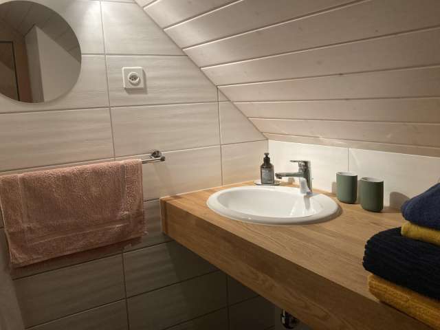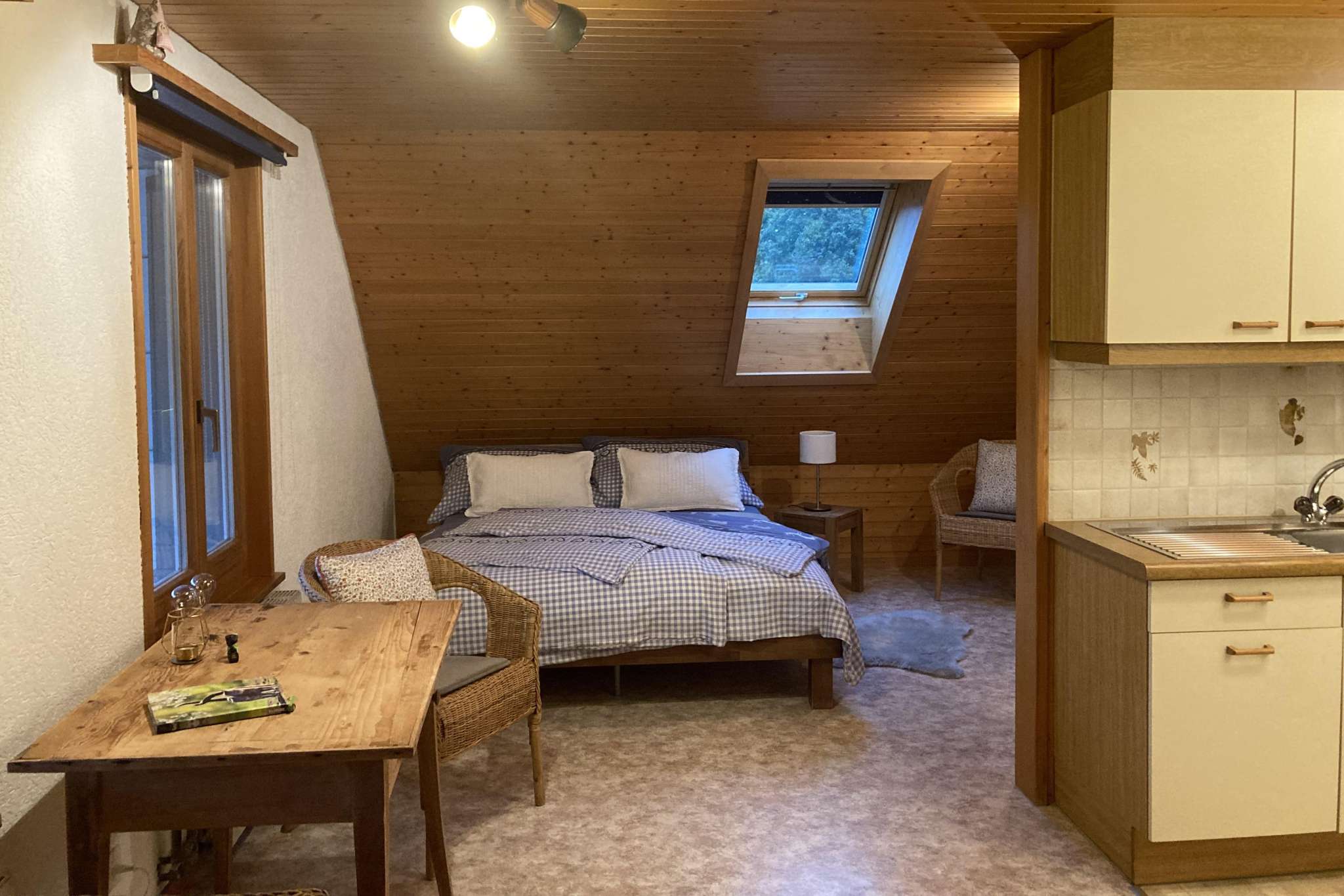 Die kleine, urchig-gemütliche Studiowohnung im 2. OG eignet sich bestens für kurze oder längere Aufenthalte. Sie bietet Platz für 2 – 3 Personen und ist Ausgangspunkt für viele schöne Wanderungen und Radtouren. Haustiere sind herzlich willkommen. Die Ferienwohnung bietet einen Park-, sowie einen Gartensitzplatz.