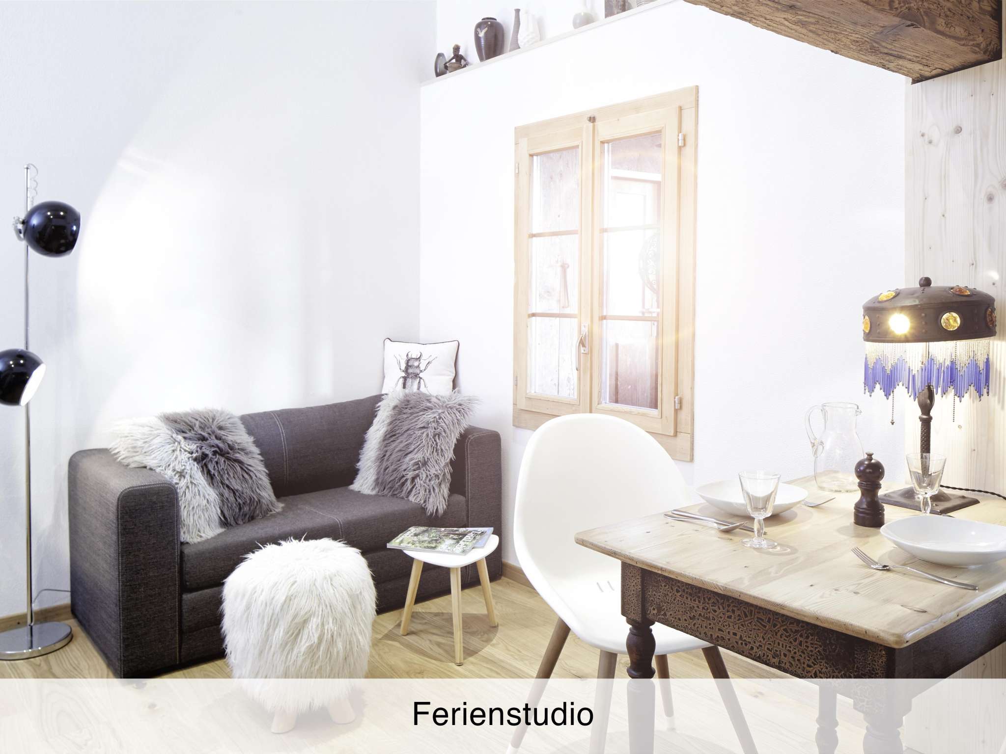 Die kleinere der beiden Unterkünfte ist das Ferienstudio. Es erstreckt sich ebenfalls über zwei Etagen. Im Erdgeschoss befindet sich eine Sofaecke, ein Ess- bzw. Arbeitstisch, eine kleine Küchennische mit allem Notwendigen, sowie ein Badezimmer mit offener Dusche. In der oberen, als Galerie angelegte Etage ist das Schafzimmer mit einem 1.60 m breitem Doppelbett.