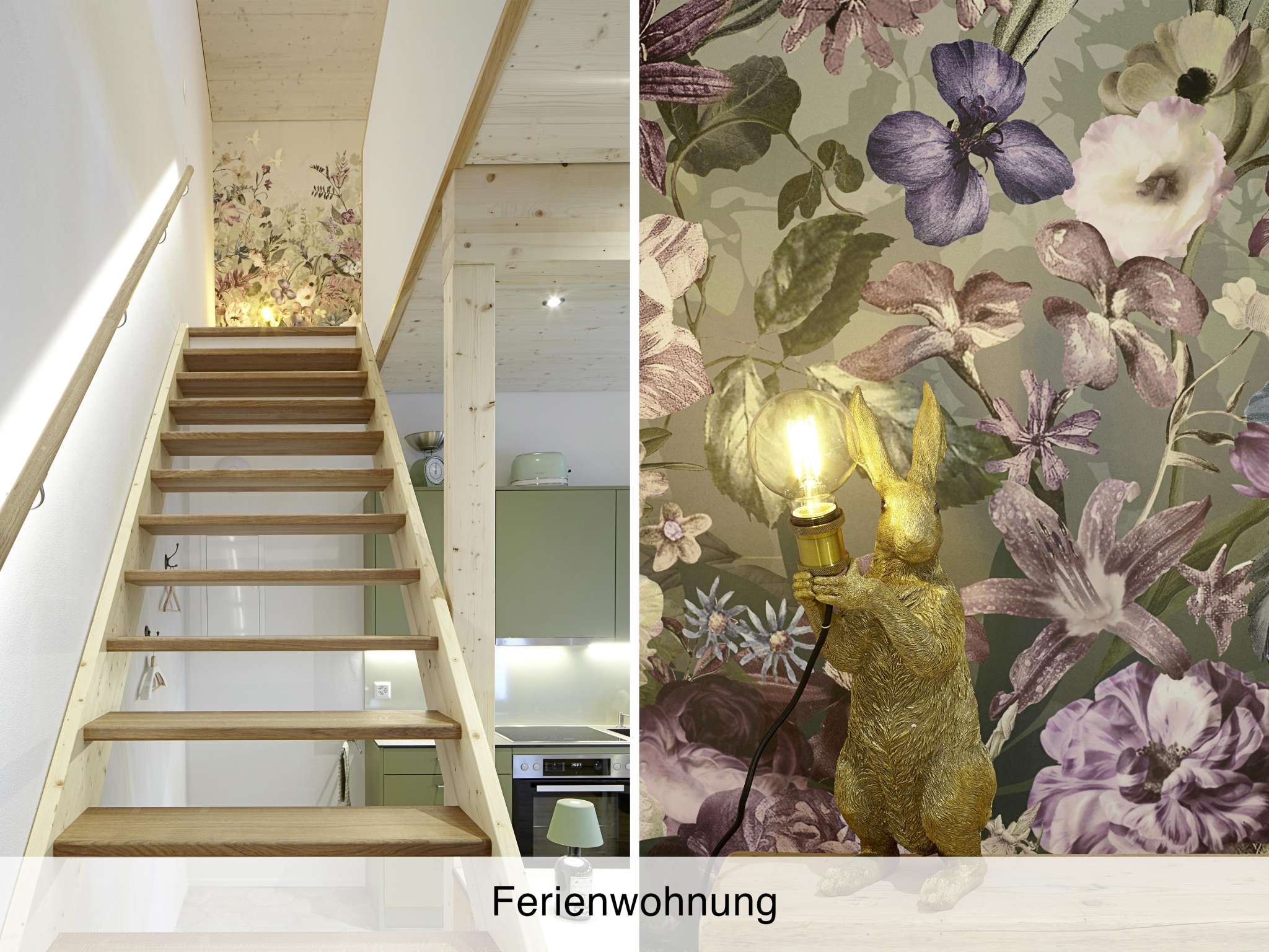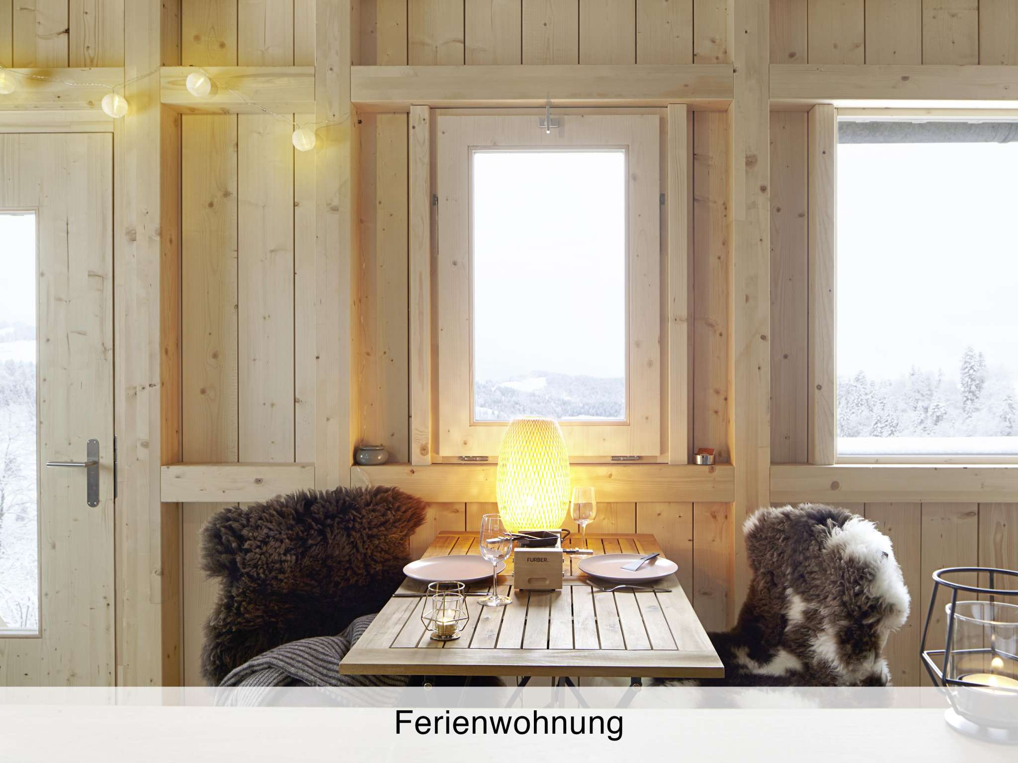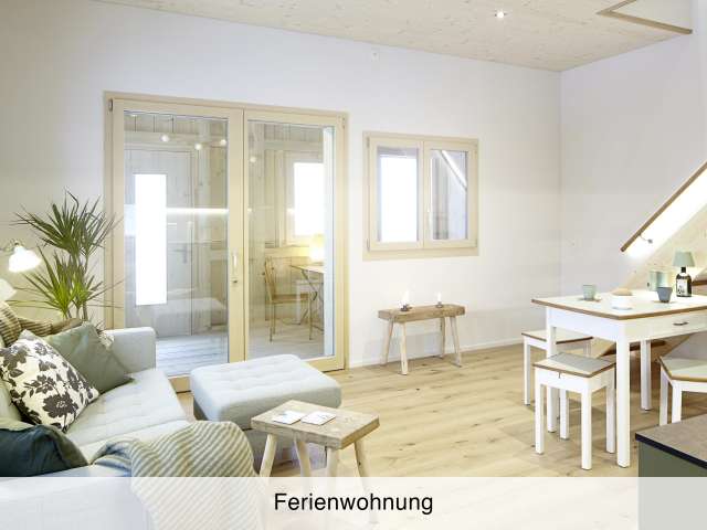 Die grössere der beiden Unterkünfte ist die Ferienwohnung. Sie erstreckt sich über zwei Etagen. Im Erdgeschoss befindet sich eine Wohnzimmer, ein Ess- bzw. Arbeitstisch, sowie eine offene Küche mit allem Notwendigen. In der oberen, als Galerie angelegte Etage ist das geräumige Schafzimmer mit zur Sonnenaufgangsseite hin ausgerichtetem Panoramafenster. Das 1.80 breite Doppelbett mit Decken und Kissen aus rein natürlichen Materialen sorgt für einen erholsamen Schlaf. Das Badezimmer mit offener Dusche befindet sich ebenfalls in der oberen Etage.