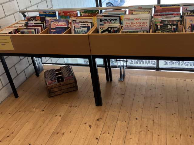 Das Sortiment ist über 2 Etagen verteilt. In der oberen Etage befindet sich der grosszügige Jugendbereich. Auch eine Kinderecke mit Sitzbereich darf nicht fehlen. Ein Vorteil der Bibliothek ist der Bring- und Hol-Ständer mit Taschenbüchern aus verschiedenen Sparten. Diese können auch von Nichtmitgliedern ausgeliehen werden. Über das ganze Jahr verteilt finden in der Bibliothek auch diverse Veranstaltungen statt.