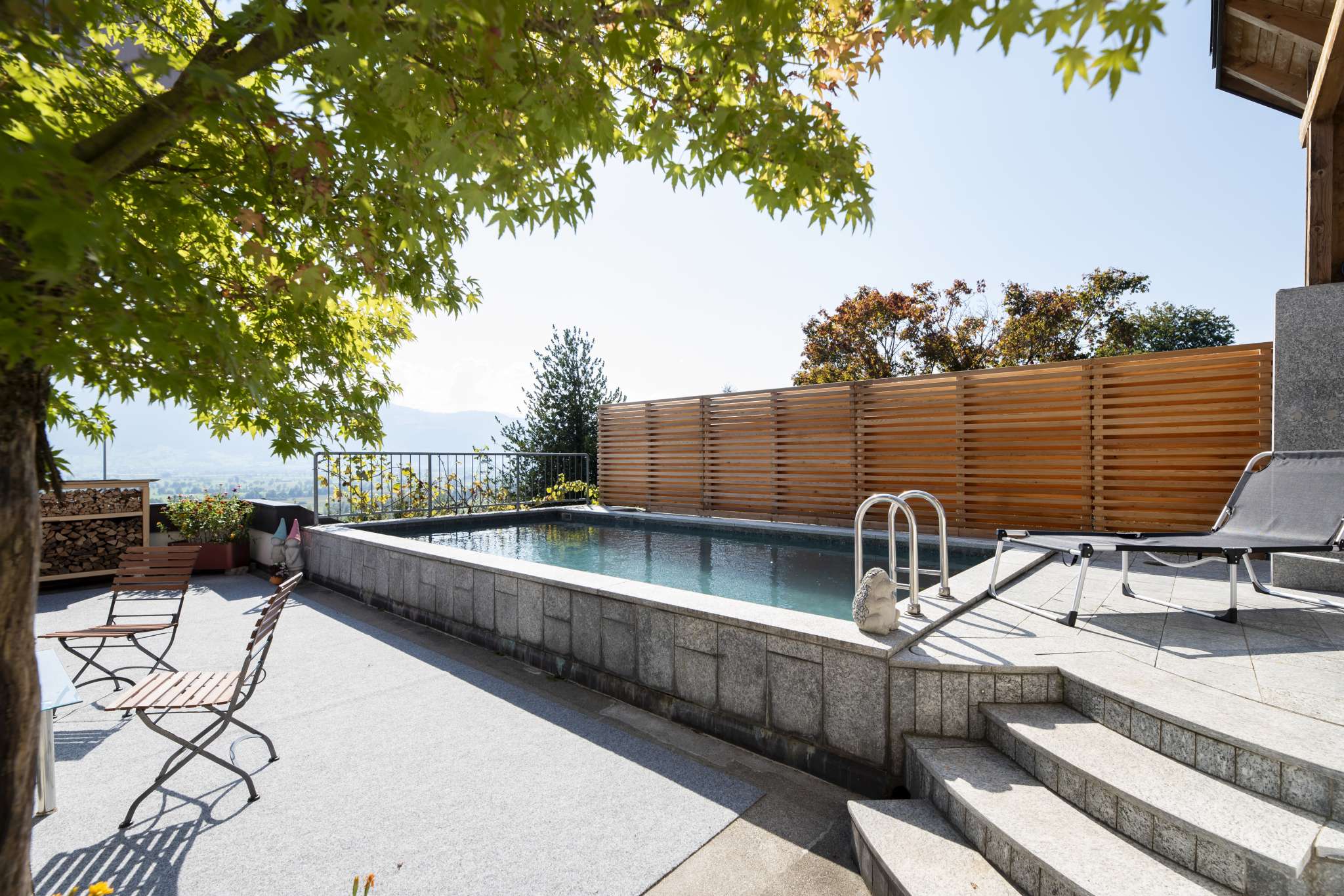 Unsere Hotelgäste kühlen sich im Swimmingpool ab und geniessen ein grosszügiges Frühstücksbuffet mit regionalen Produkten.