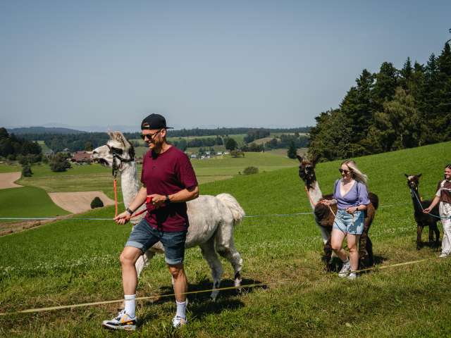 Lamas, die zur Gattung Kamele gehören, sind in Südamerika beheimatet. Das schweizerische Klima behagt ihnen sehr. Ihr sanfter, gutmütiger Charakter begeistert immer wieder. Auf dem Lamahof Tschäppel können Sie mit den Tieren näher in Kontakt zu kommen und eine Wanderung mit den Lamas und einer Begleitperson zu unternehmen Die Lamawanderungen sind als Gruppenaktivität buchbar. Einzelpersonen können sich bei den rund 12 öffentlichen Lamawanderungen pro Jahr anmelden.