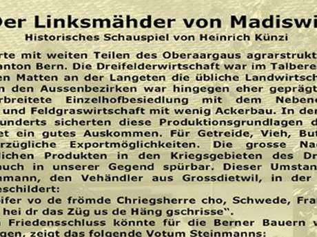 Erzählt von Ueli, dem Linksmähder, und ist eine alte Sage von Madiswil. Es gibt verschiedene Varianten, eine davon erzählt folgendes: Es war einmal ein reicher Bauer. Der hatte eine bildschöne Tochter namens Vreni, welche vielen Männern gefiel - auch Ueli, der bei ihrem Vater um ihre Hand anhielt. Vreni's Vater wollte sie aber nicht so leicht weg geben und forderte Ueli auf, ein Kreuz in die Grossmatt zu mähen. Weil er gut mit der linken Hand mähen konnte, musste er dies auch links herum tun. Er ging eifrig an die Arbeit, bis er plötzlich ein Schlag im Herz spürt. Dies musste seine alte Kriegswunde sein! Er war beinahe fertig und strengte sich an für den letzten Streich. Doch dieser kostete ihm das Leben.