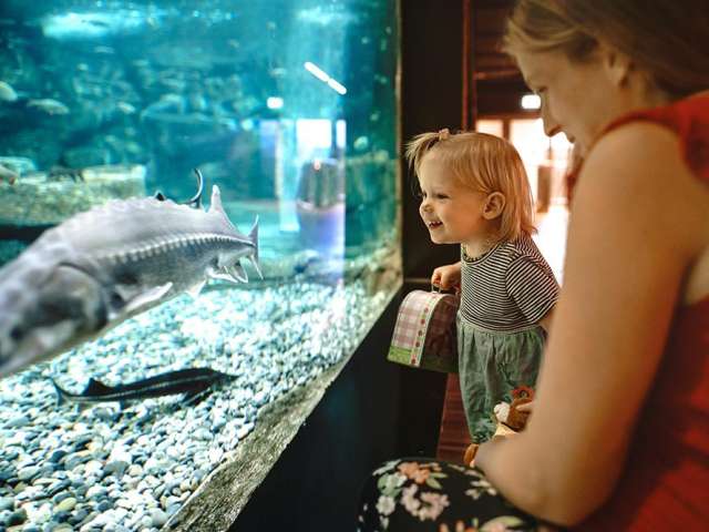 Tauchen Sie zudem ab in die faszinierende Unterwasserwelt mit riesigen Aquarien in einer Gesamtlänge von 42 Metern. Die vier Becken mit mehreren tausend Litern Wasser werden von diversen Fischen wie Stören, Welsen, Rochen und vielen anderen bewohnt. Ebenfalls können in diesem Raum Anlässe bis zu 700 Personen stattfinden. Für aktive Unterhaltung sorgen das Bowling- und Fitnesscenter.