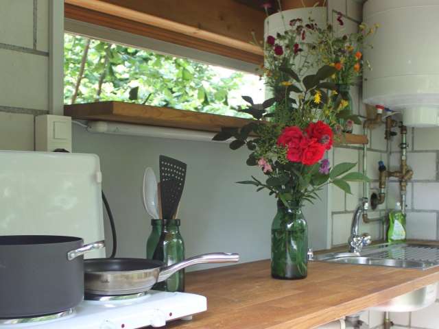 Der Wohnwagen, mit Blick auf eine grüne Wasserwiese und mit ein wenig Glück sogar ein paar galoppierende Pferde, bietet Platz für zwei erwachsene Personen. Aus der Sitzgruppe beim Eingang kann ebenfalls eine weitere Schlafmöglichkeit gemacht werden. Die mit den Spychergästen gemeinsam genutzten Toiletten und der Küchenbereich befinden sich ausserhalb des Wohnwagens.