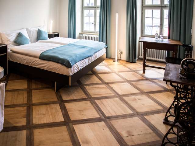 Die Amélie-Moser Stube ist mit ihrem Kachelofen im Rokoko-Stil sowie dem wunderschönen Parkett und Deckenrhombus aus Gipsstuck das Bijou unter den Räumen im Kreuz.