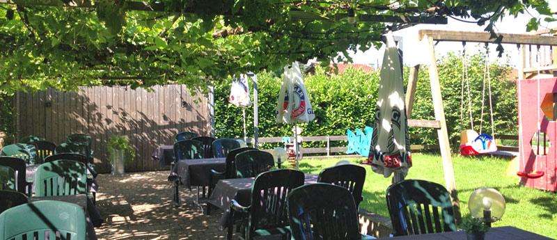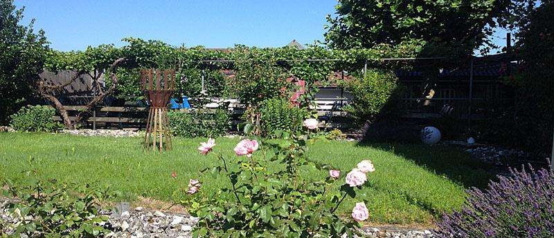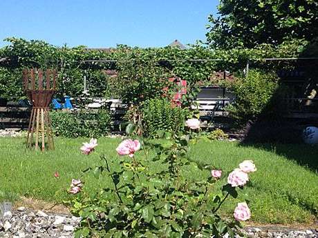 Kinderspielplatz direkt neben der mit Weinreben gedeckten Gartenterrasse.