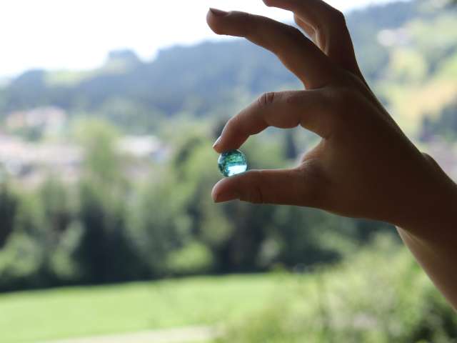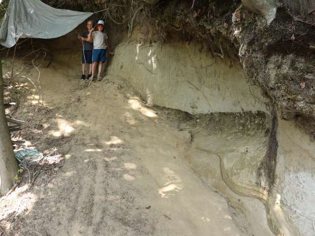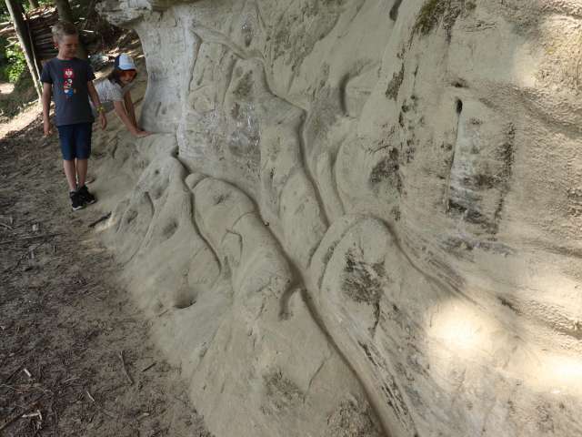 Der Sandstein ist ziemlich murb. Deshalb sollte man hier nicht darauf herumklettern. Und nun müssen die Bahnen erst mal gereinigt werden. Dann kann der Test losgehen: Welche Murmel bleibt am längsten in der Bahn? Das Resultat: Die kleinen kommen am weitesten. Und eine weitere Erkenntnis: Es lohnt sich, genug Murmeln mitzunehmen. Denn springt eine aus der Spur, ist sie schnell über den Wanderweg gehüpft und verliert sich im abschüssigen Waldboden.