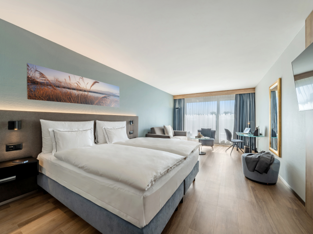 Direkt vor dem Hotel liegt das Naturschutzgebiet mit exklusiver Fauna und Flora. Bezaubernde Sonnenuntergänge gibt’s im SEEDAMM PLAZA kostenlos dazu.