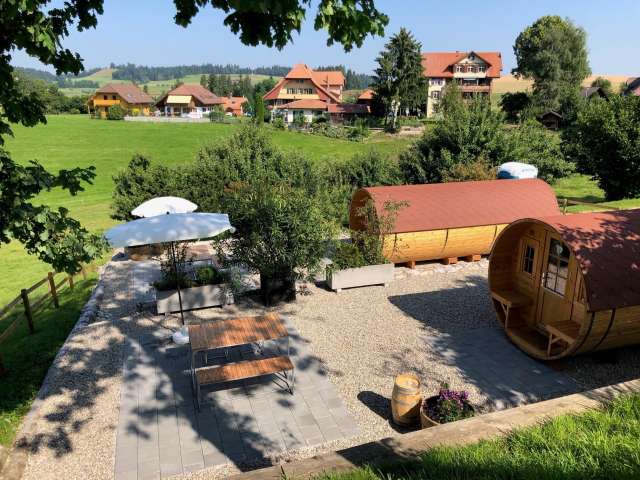 Mit herrlichem Blick ins wildromantische Emmental, umgeben von saftigen Matten, grasenden Kühen und ganz viel Zeit für sich selbst, sind die Wohnfässer der Emmentaler Schaukäserei der ideale Ort, um zu übernachten. Die Südwestlage verspricht einen romantischen Sonnenuntergang, begleitet mit einem leckeren Abendessen auf der eigenen Terrasse. Jedes Fass bietet Platz bis zu vier Personen und ist mit fliessend Wasser, Kühlschrank, Kaffeemaschine, eigenem Sitzplatz und Velo- bzw. Autoparkplatz ausgestattet. Eine Dusche ist nicht vorhanden.